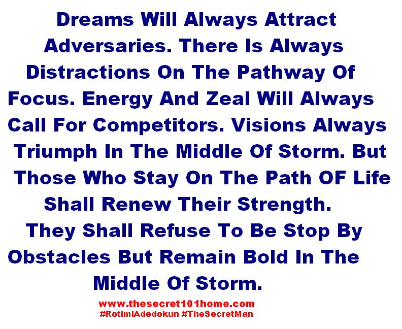Dreams Will Always Attract Adversaries. There Is Always Distractions On The Pathway Of Focus. Energy And Zeal Will Always Call For Competitors. Visions Always Triumph In The Middle Of Storm. But Those Who Stay On The Path OF Life Shall Renew Their Strength. They Shall Refuse To Be Stop By Obstacles But Remain Bold In The Middle Of Storm.