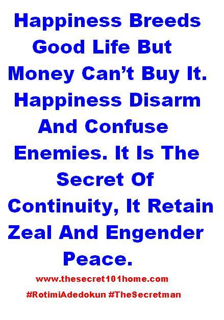 Happiness Breeds Good Life But Money Can’t Buy It. Happiness Disarm And Confuse Enemies. It Is The Secret Of Continuity, It Retain Zeal And Engender Peace.