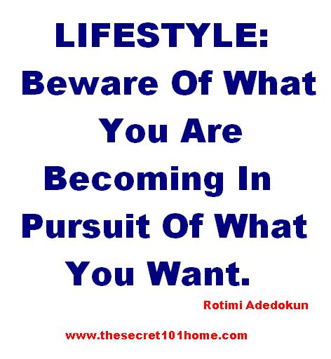 1. The Life That You Are Living Is Much More Important Than What You Want To Become. This Is The Secret Beware Of What You Are Becoming In Pursuit Of What You Want. It Is Called Lifestyle. The Life Which You Choose To Live While You Are Still On Earth.